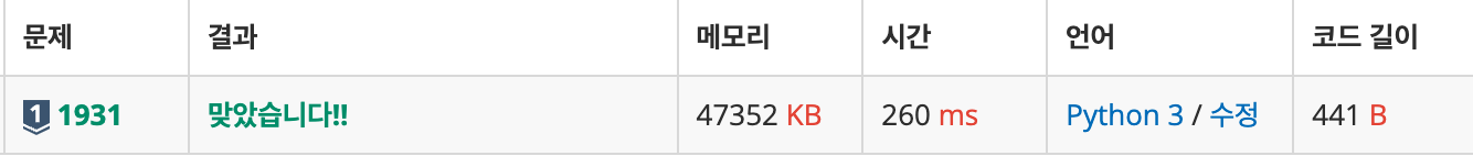 - 끝나는 시간과 다음 회의 시작 시간을 비교(끝나는 시간보다 다음 회의 시작 시간이 클 경우 회의 가능)